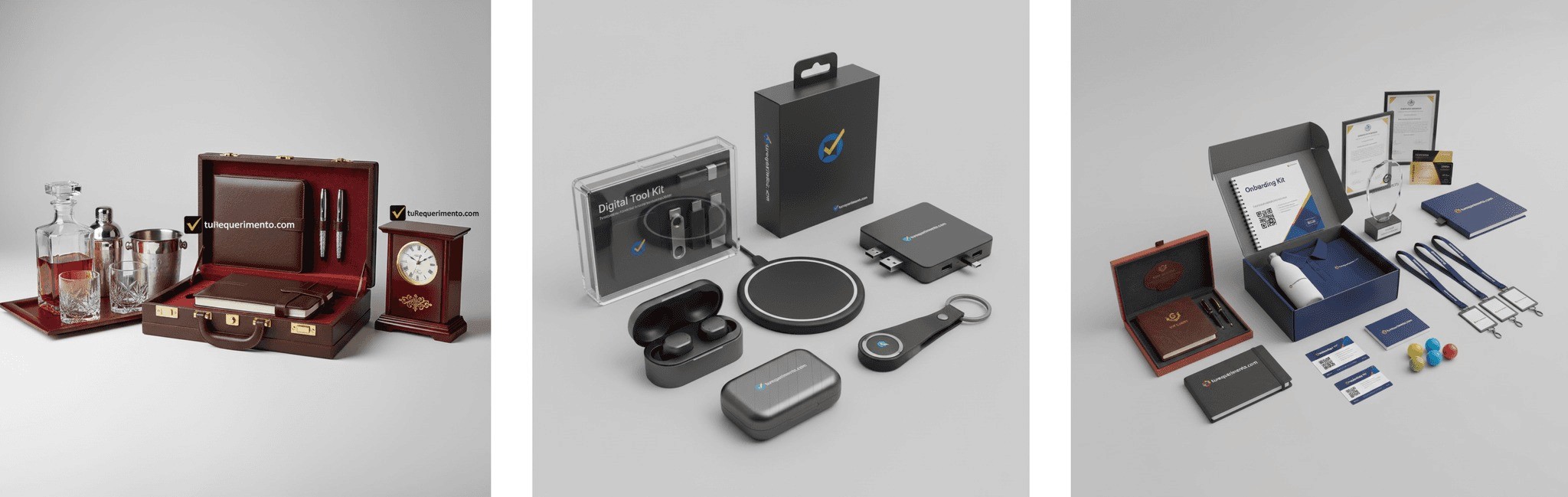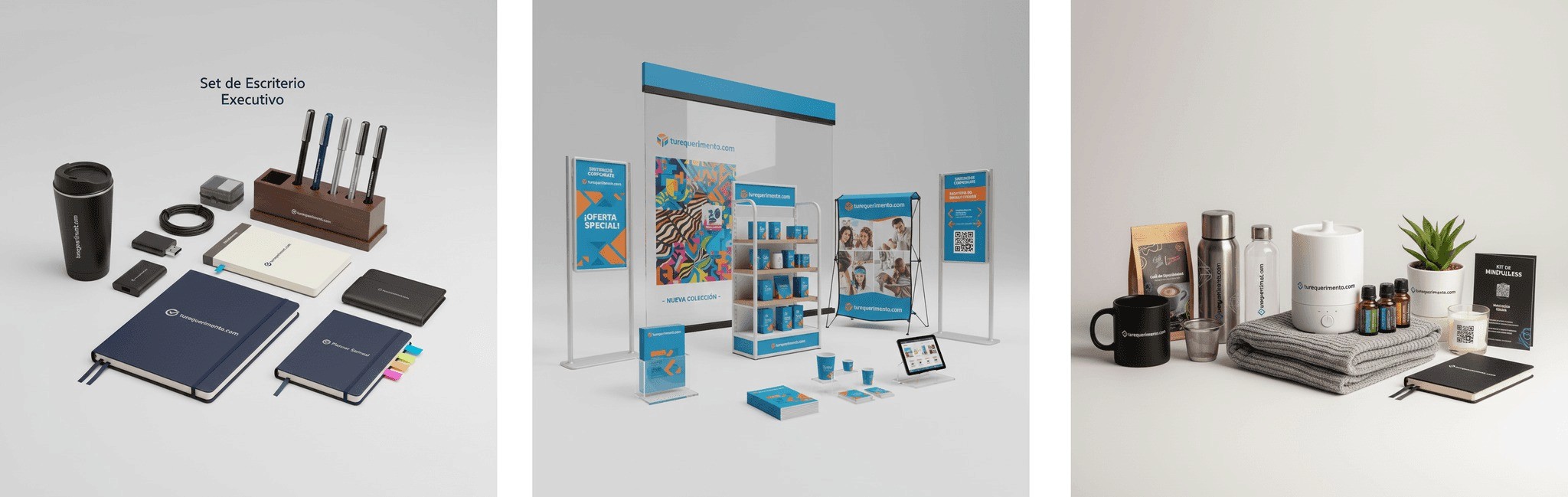 – Kits ejecutivos: Tazas térmicas, agendas, bolígrafos premium, power banks y sets de escritorio.